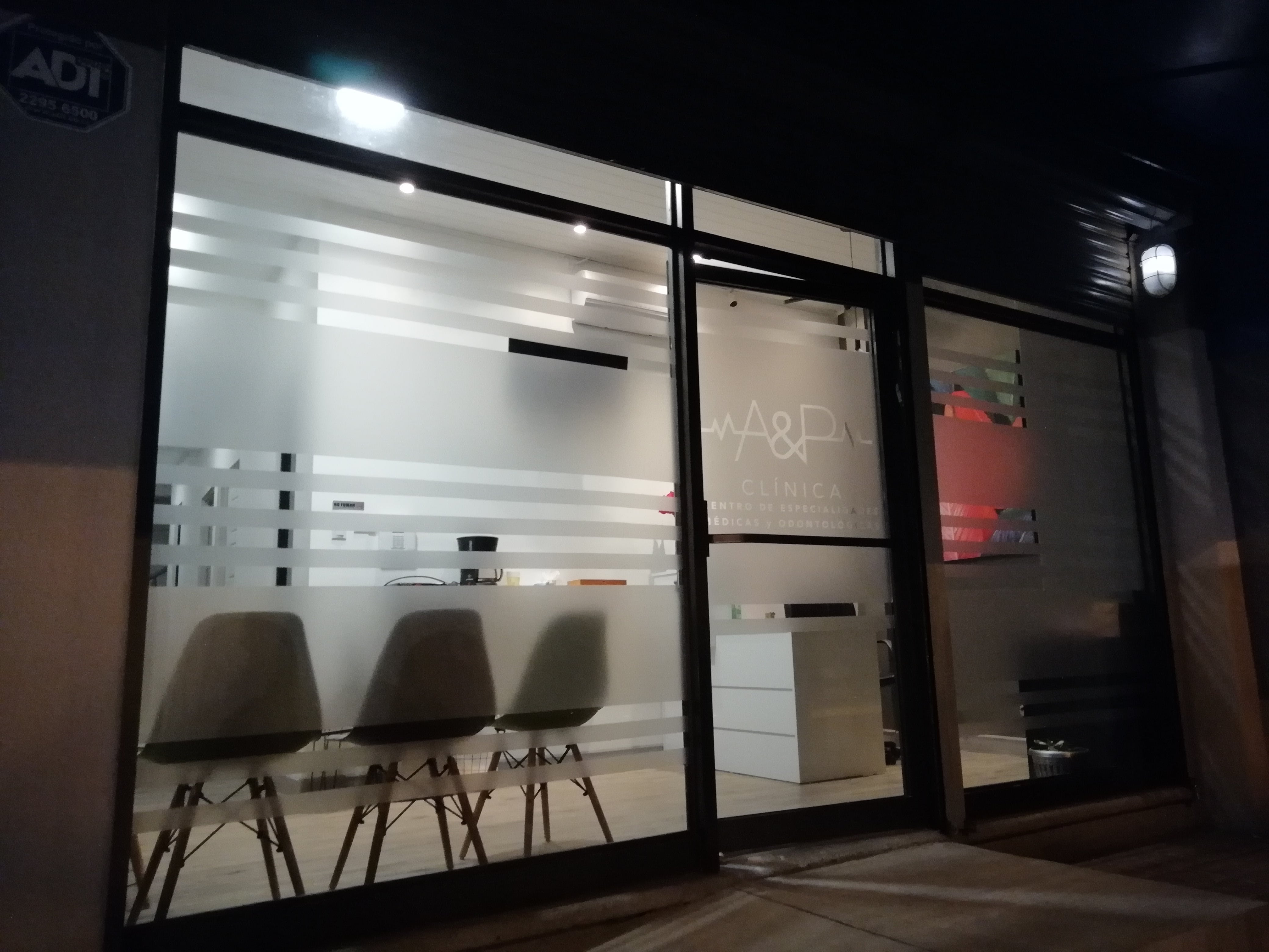En esta clínica instalamos unas líneas de sandblasting y en la puerta instalamos una película de sandblasting con su logo precortado con el fin de proveer a la clínica identidad y a la ves un estilo   .